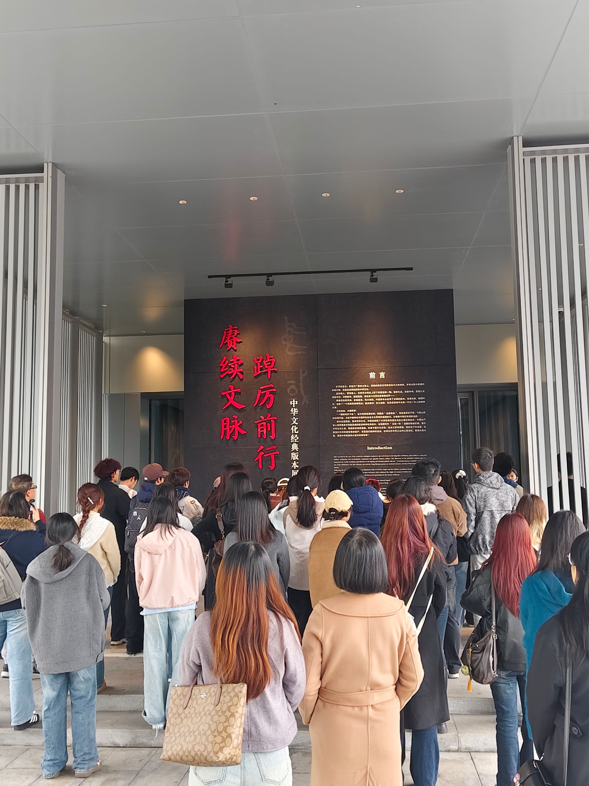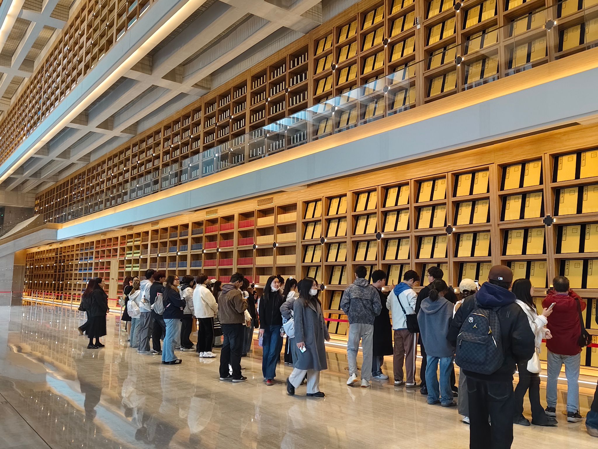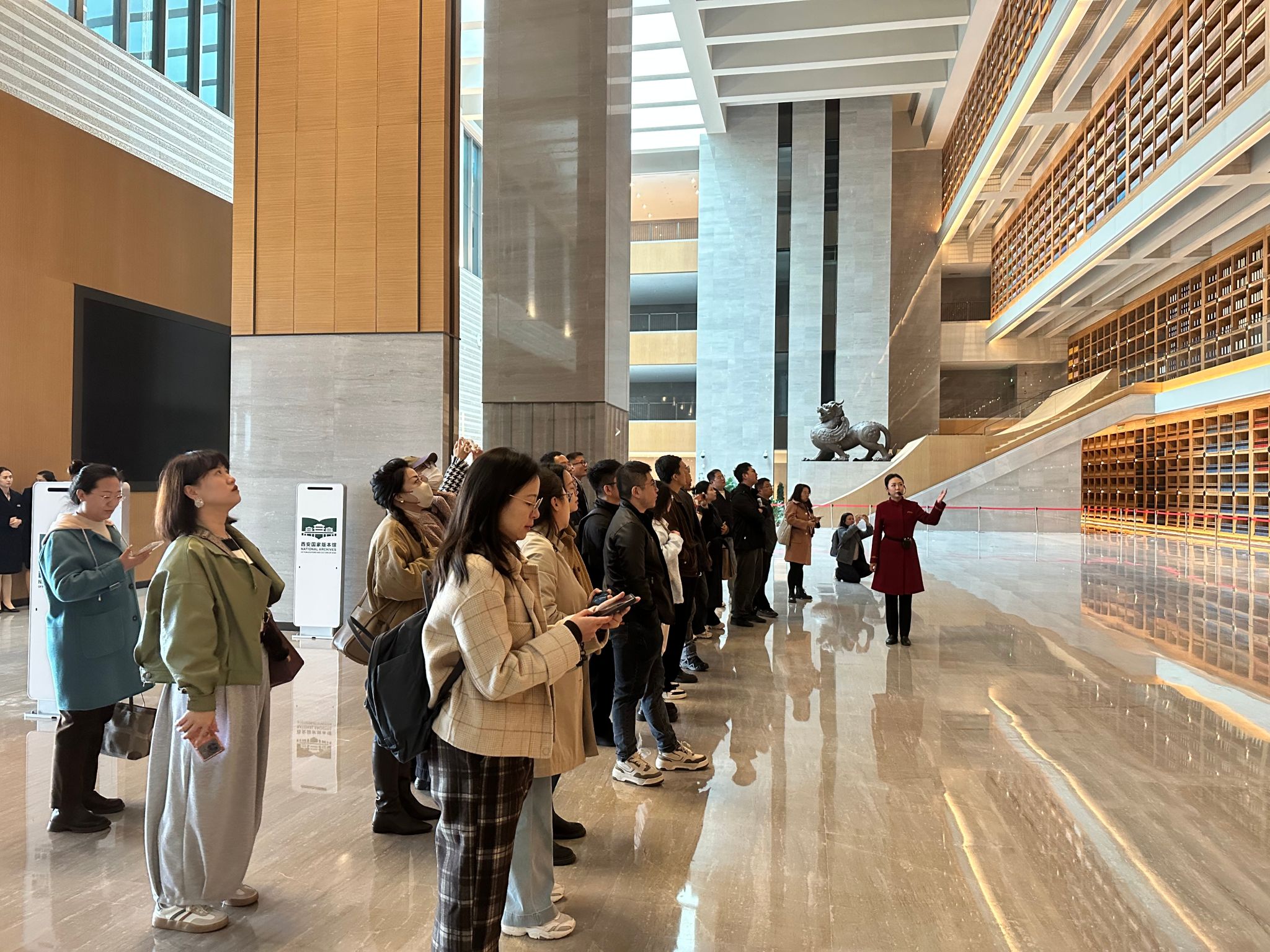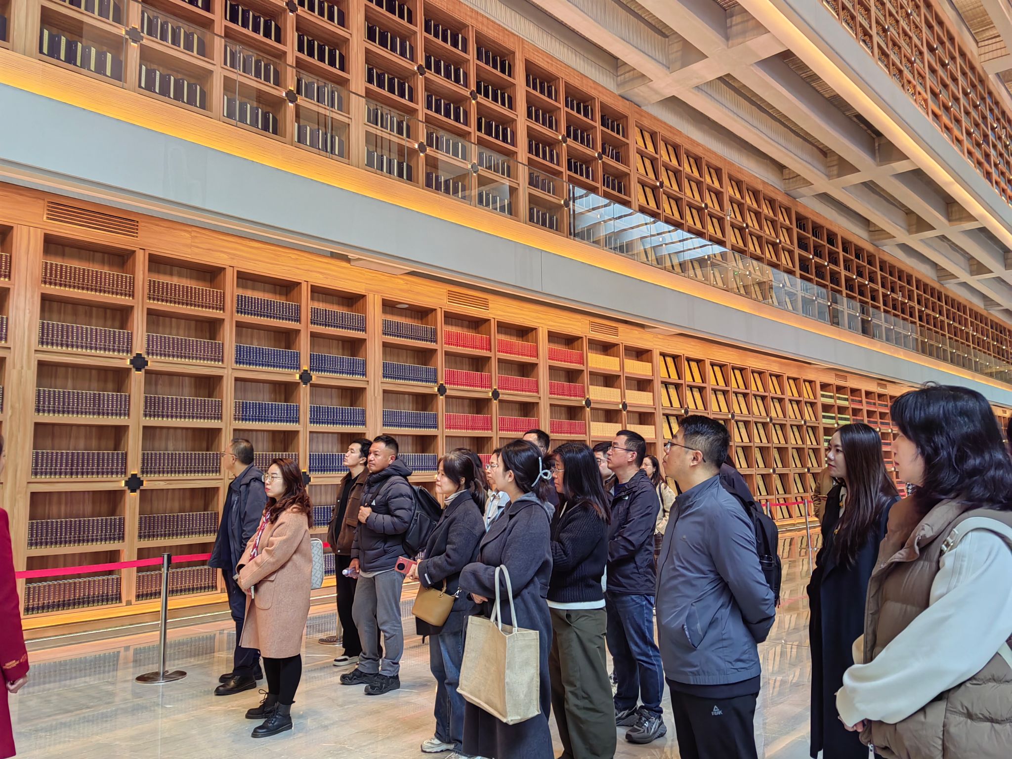 走进国家版本馆核心建筑文济厅,宽90米、高20米的巨型通顶书墙瞬间震撼全场,五万余册精品图书整齐陈列,彰显着中华文化的磅礴气势。师生们认真聆听讲解,深入了解场馆“一总三分”的战略布局、“汉唐气象、中国精神”的设计理念,深刻认识到版本馆作为文明传承载体的时代价值。