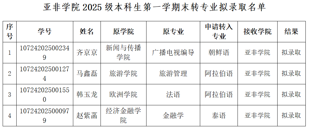 根据《西安外国语大学本科学生转专业实施办法(试行)》(西外发〔2025〕56号)文件精神和学校2025年度本科生第一学期末转专业工作安排,经学生个人申请、博彩网址导航 审核、组织面试,现将博彩网址导航 转专业拟录取结果公示如下: